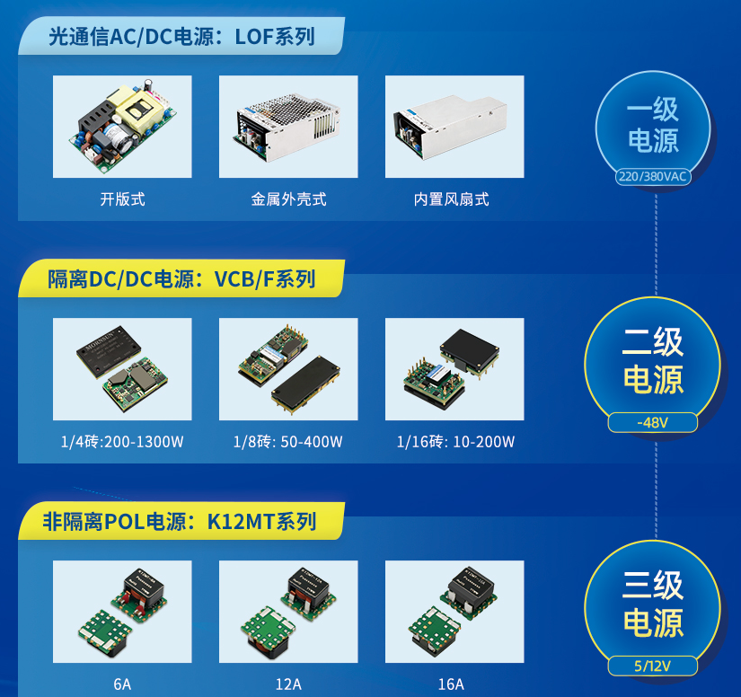 Weho’s power supply solutions in the communication industry can be divided into one, two, and three levels of power supply according to the input front-end to the back-end. They are 15-1500W chassis switching power supply, 3-1300W isolated DC/DC power supply, 6-60A domestic non-isolated POL power supply K12MT and K12DT series. The following will combine the common infrastructure applications in the communication industry to demonstrate the high-energy adaptation of weho power supplies in the communication industry.