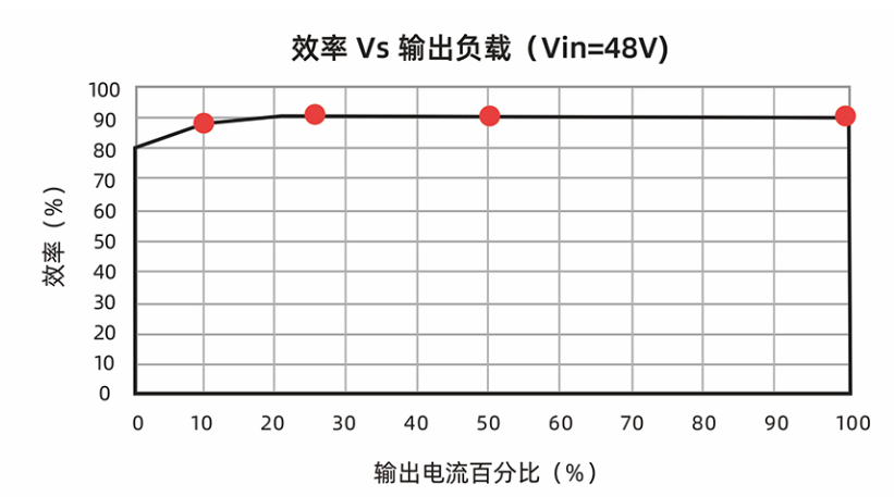 Weho’s economical brick power supply VCB/VCF series adopts frequency conversion and active clamping technology, which can effectively improve the conversion efficiency of the power supply under various loads, at 25%, 50%, 75%, and 100% four load points Average efficiency >90%. Taking the 1/4 brick power supply as an example, the efficiency of 25% light load is as high as 94% (the market solution is mostly 90%), the efficiency of 50% half load is as high as 95%, and the efficiency of 100% full load is as high as 95%.