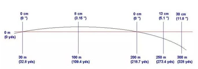 Since the bullet is flying in a parabola, it must rise first and then descend. In the above picture, the bullet coincides with the aiming line at 200 meters. That is to say, if the target is at 200 meters, the bullet can hit the aiming point after shooting.