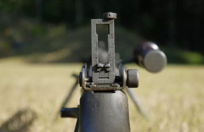 The picture above is the American M1918A2 automatic rifle with the gauge erected, which is the familiar BAR automatic rifle. You can see that there are numbers on both sides of the scale frame, which are arranged alternately from bottom to top, from 1 to 15. There is also a YD lettering on the top of the scale frame, which stands for yard, and its meaning is 100 yards to 1500 yards, every 100 yards. . At present, the cursor of the rear sight is at the lowest position of the gauge, which is 100 yards. Suppose now that you want to shoot a target at 500 yards, move the cursor of the rear sight up to the scale 5. The position of the rear sight is high. If the barrel is still level state, then when looking forward from the rear sight hole, the line of sight passes above the sight of the muzzle, and the sight is invisible.